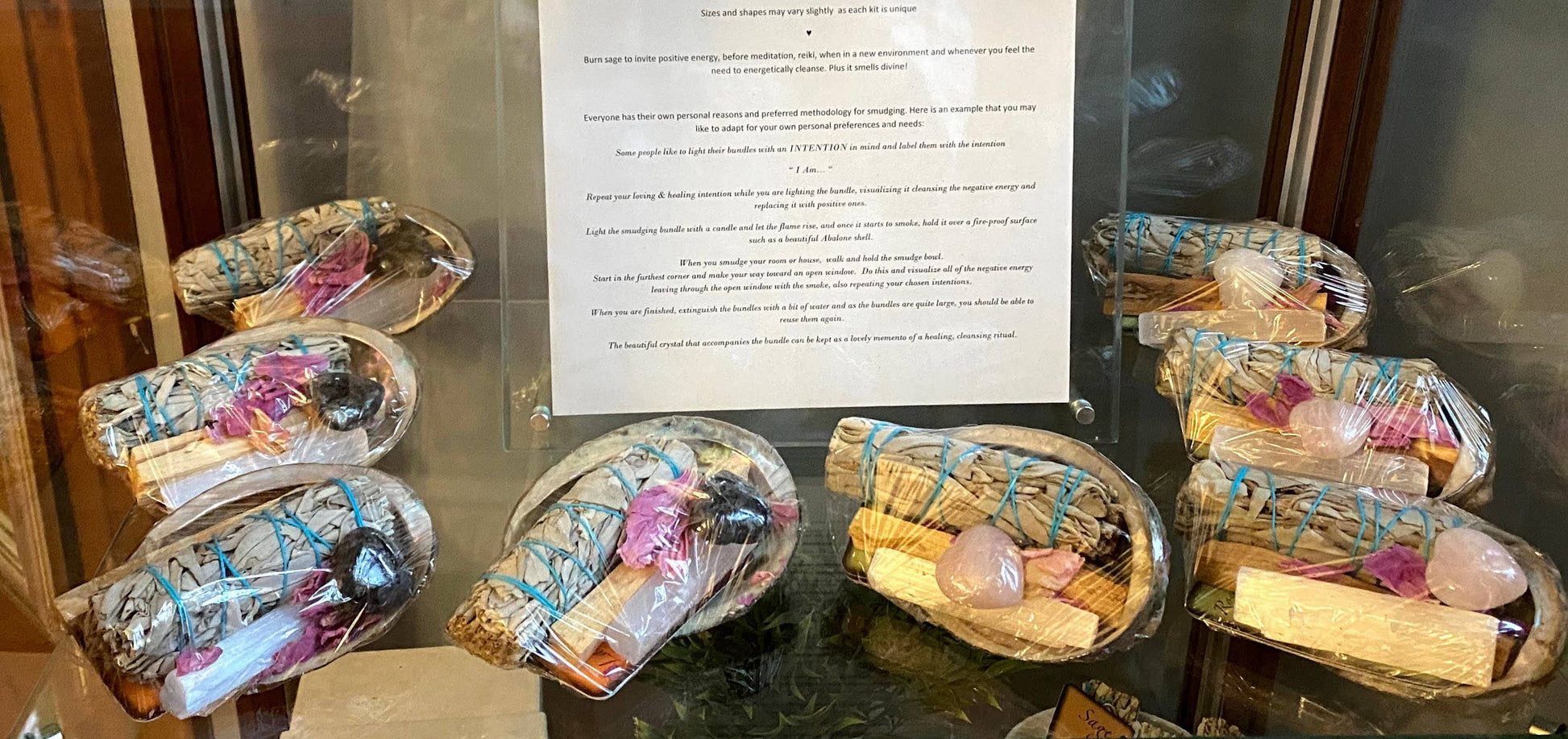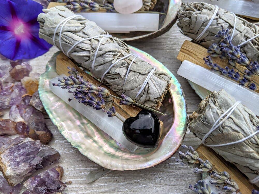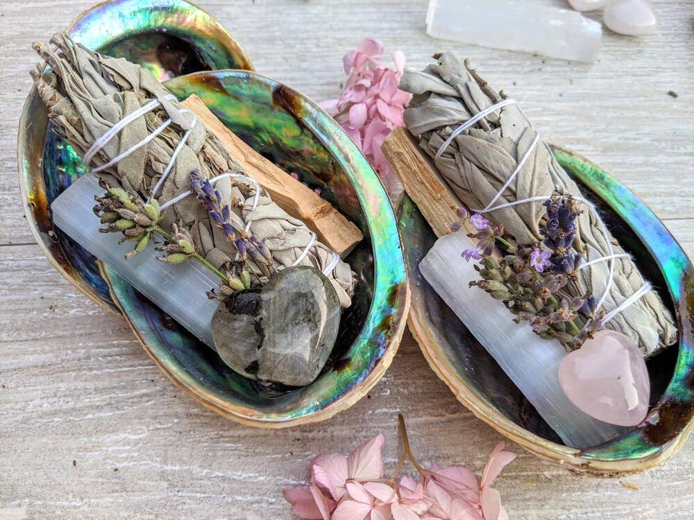 Sage Energetic Cleansing Sets. Smoke cleansing, Smudge kits. These are gorgeous kits that are perfect for beginners and for gift giving. Includes: Organically homegrown Lavender and/or organically homegrown rose petals or peony petals. Abalone shell sustainably sourced with stunning iridescent natural colours. Palo Santo stick from Peru - known as “Holy Wood” divine woodsy fragrance when burned White sage bundle Selenite wand A beautiful crystal specimen 4 Professionally illustrated Original Cards. Each card has Frontal illustrations and Backside has instructions on cleansing / or properties of/ with: Palo Santo and Sage, Selenite information card and Information card of the crystal of your choosing